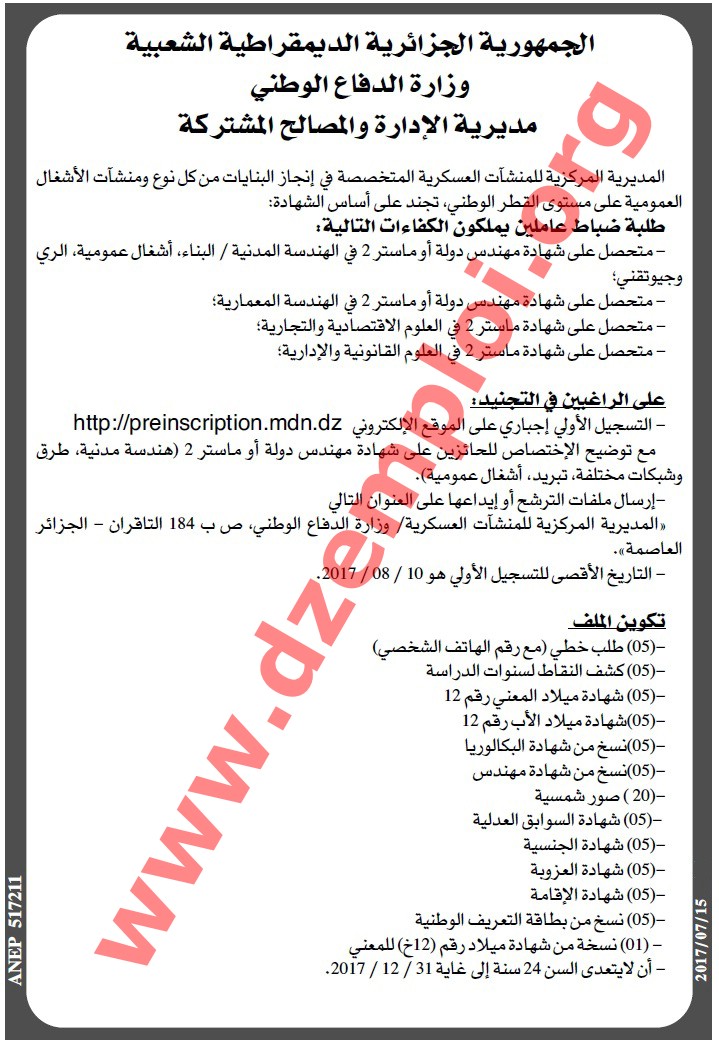 إعلان توظيف في مديرية الإدارة والمصالح المشتركة وزارة الدفاع الوطني جويلية 2017 المناصب المفتوحة: طلبة ضباط عاملين إعلان توظيف في مديرية الإدارة والمصالح المشتركة وزارة الدفاع الوطني جويلية 2017